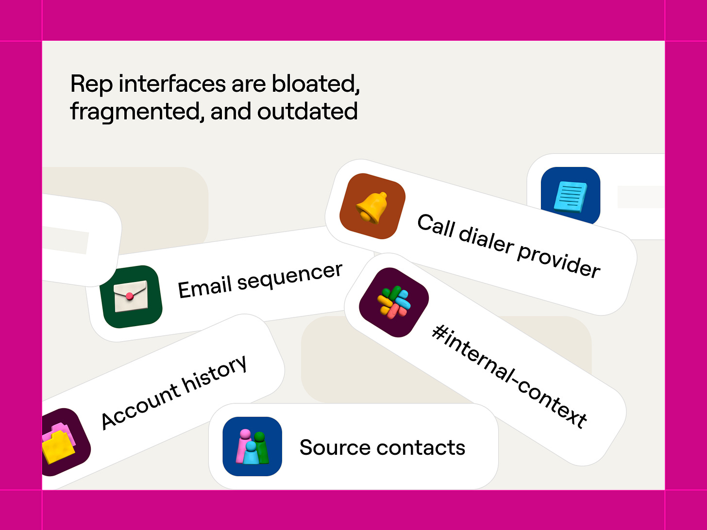 None of these systems talk to each other in a clean way. And reps are expected to stitch together a coherent workflow while hitting quota. Even worse, most of these tools are one-size-fits-all, which doesn’t help when companies and reps are looking for specific signals and functionalities. Every organization wants to run unique motions and use data differently, and static rep interfaces make that more difficult.