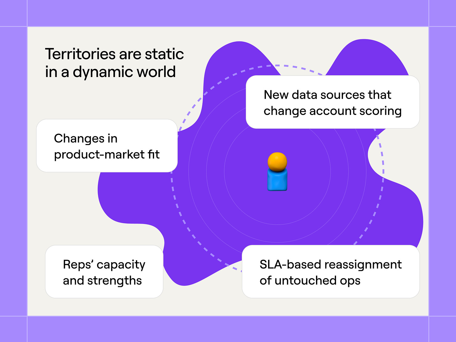 Most sales teams build territories once a year. But the calendar doesn’t care about how efficient and equitable that exercise was. Product launches, economic shifts, elections, layoffs—a lot can affect who should be working on which accounts. If your top reps are stuck with stale books while new signals go to low-performers, it can create even more disequilibrium.