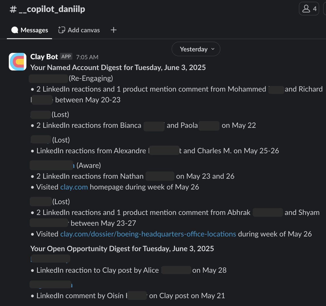 This isn’t something you solve in one sprint. But by running controlled experiments, instrumenting for outcomes, and iterating on signal logic, you can gradually move from noisy alerts to intelligent pipeline triggers. At Clay, we combine multiple data sources into one enrichment stream and apply logic and weighting to prioritize high-signal accounts. Our centralized GTM Engineering team adjusts these almost weekly. We’re also experimenting with signal combinations and tracking downstream pipeline results to test different approaches. Here is a look at a recent interaction of our rep signals interface (done in Slack).