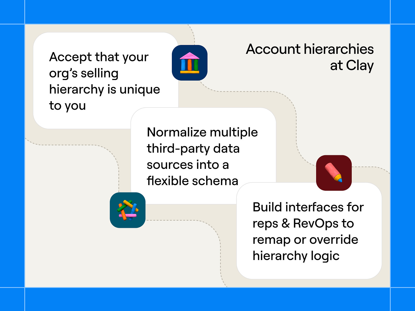 Third-party databases also rarely reflect how your company actually wants to sell. So RevOps teams end up duct-taping hierarchies together manually, which doesn’t work.