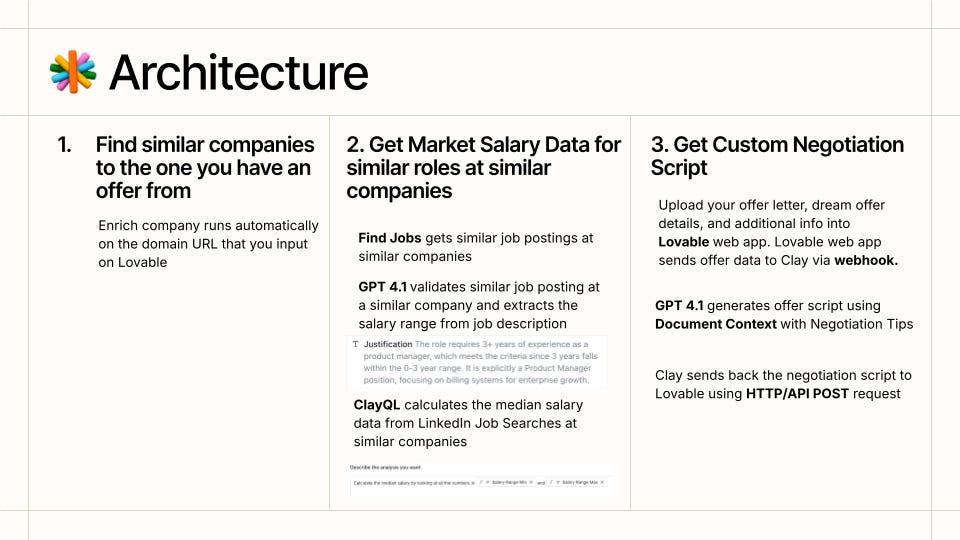 Izzy is on the Clay customer education team and created a comprehensive salary negotiation platform that rivals enterprise compensation tools. The system: