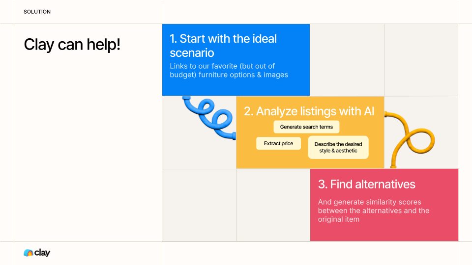 When most people think of Clay, they envision teams enriching lead data and automating outreach sequences. But data enrichment, AI processing, and automated decision-making can help do just about…anything. And that includes figuring out where to get a slice of pizza or how to find furniture dupes for any budget.