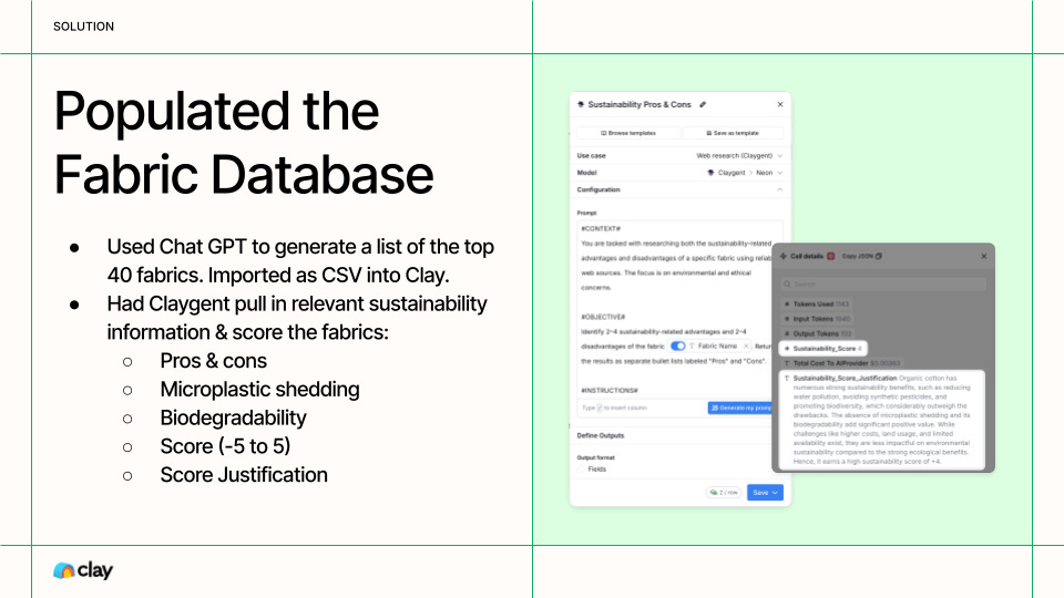 Generated a fabric database using GPT and Claygent to pull sustainability data on 40+ materials