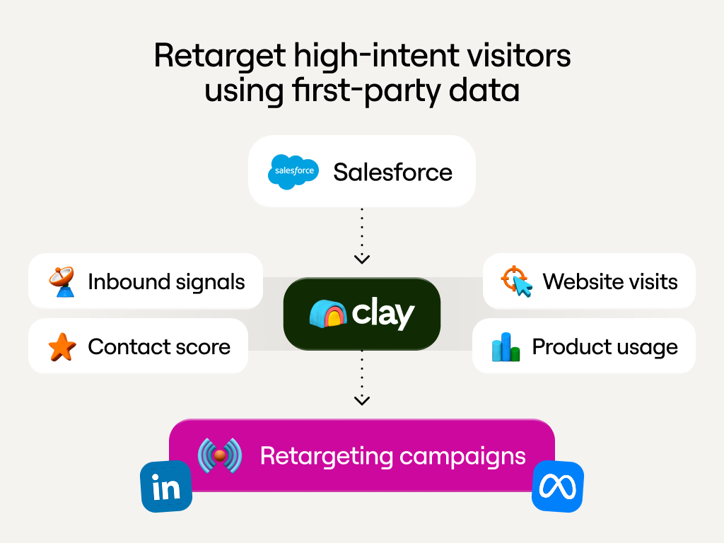 Clay expanded retargeting beyond website visits to include product usage data, inbound interactions, contact scores, and lead scores all pulled directly from Salesforce.