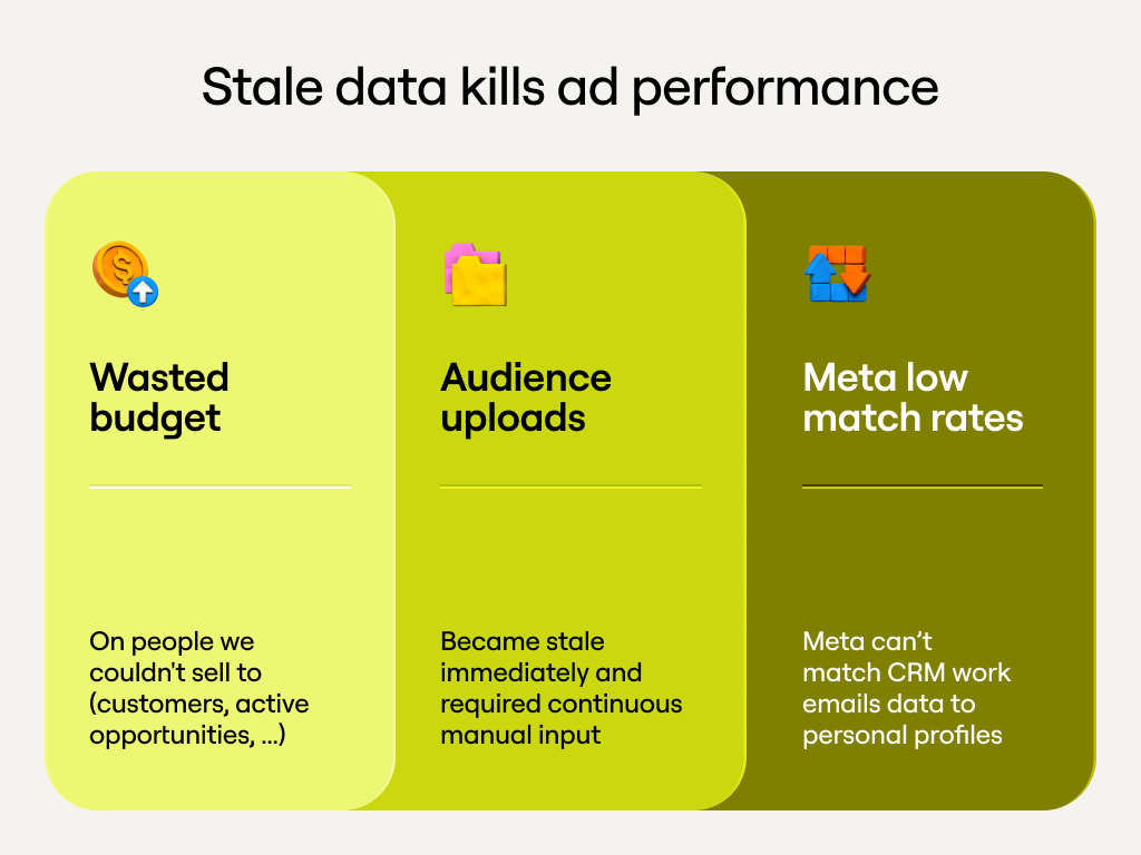 Most B2B companies still manually export CSVs and upload them to ad platforms. Their audiences go stale within days, they can’t effectively use Meta, and they waste budget on people they shouldn’t target.