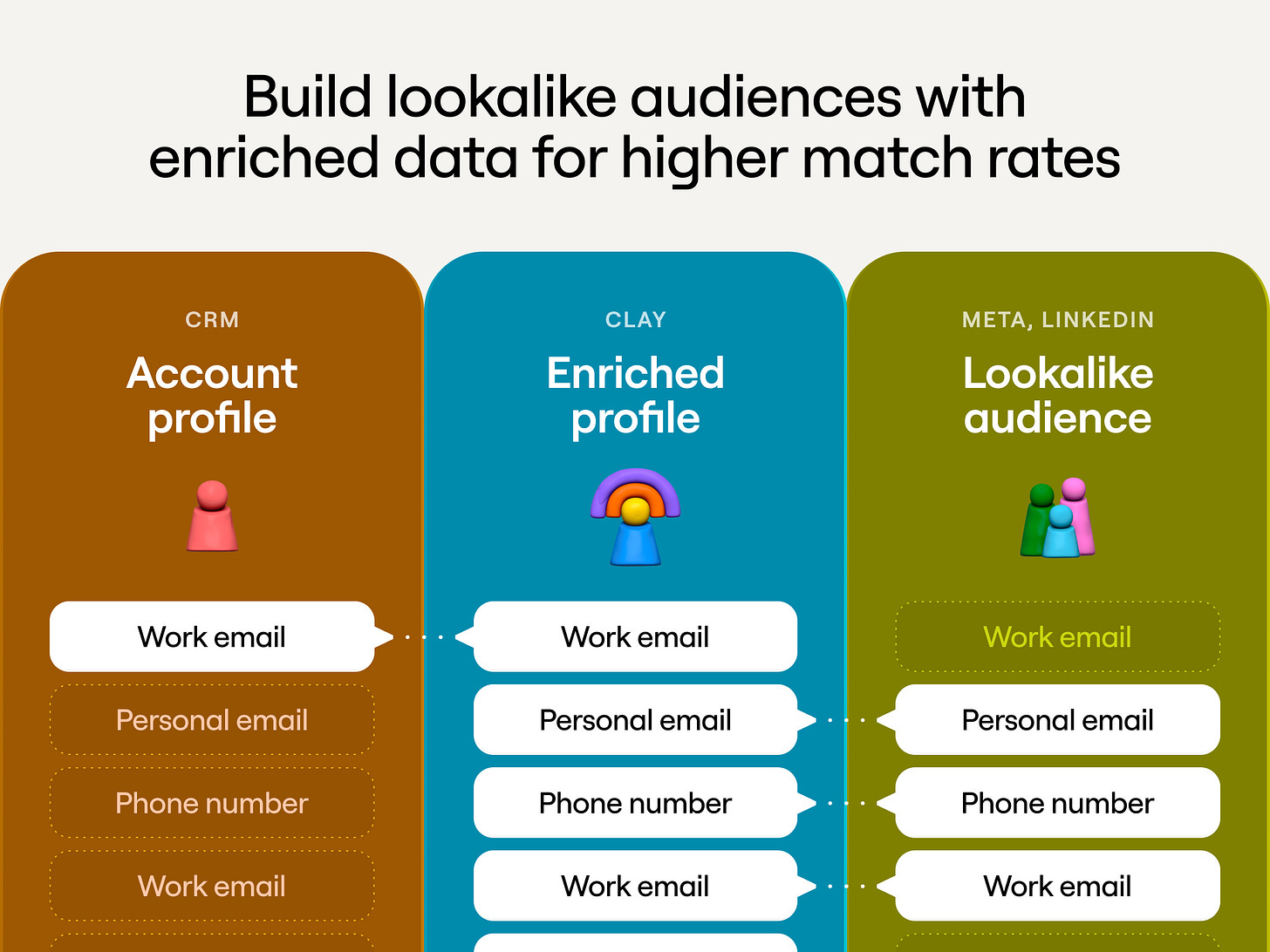 Clay solves this by automatically enriching customer lists with personal emails, phone numbers, and other data points that Meta can match. This increases match rates from the typical 30% to 70%+, making lookalike campaigns actually work for B2B.