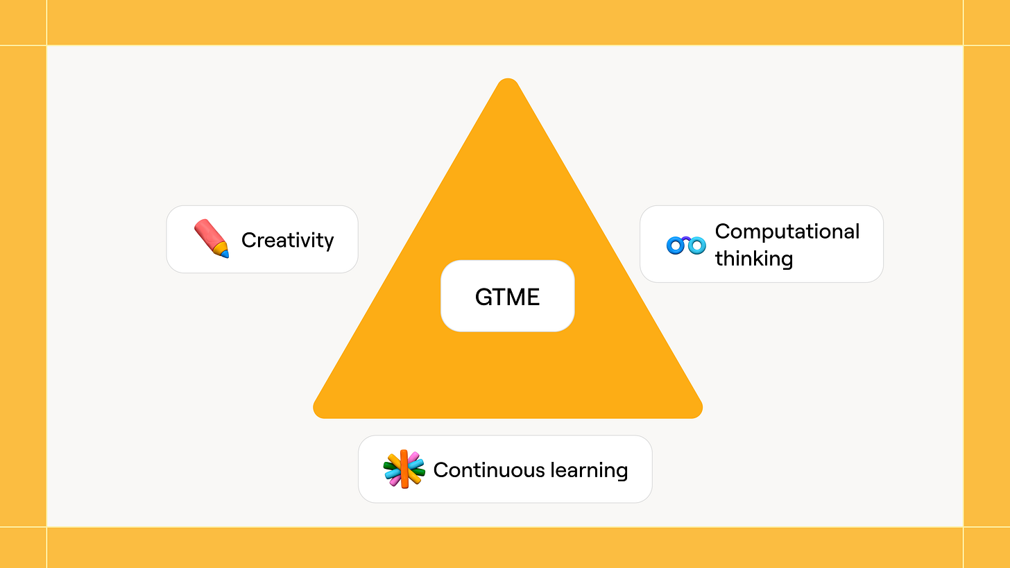 What's particularly valuable about Maria's analysis is how she connects this to hiring strategy. She found that companies focusing on background and experience often miss candidates who have the right mindset but haven't followed traditional career paths. Maria identified what she calls the core skill triangle for potential GTMEs: creativity, continuous learning, and computational thinking. One expert told her about successful GTM Engineers "coming from completely different backgrounds, but they wanted to go into this space, they just sat down there, they started learning on mistakes, on successes... and they became successful."