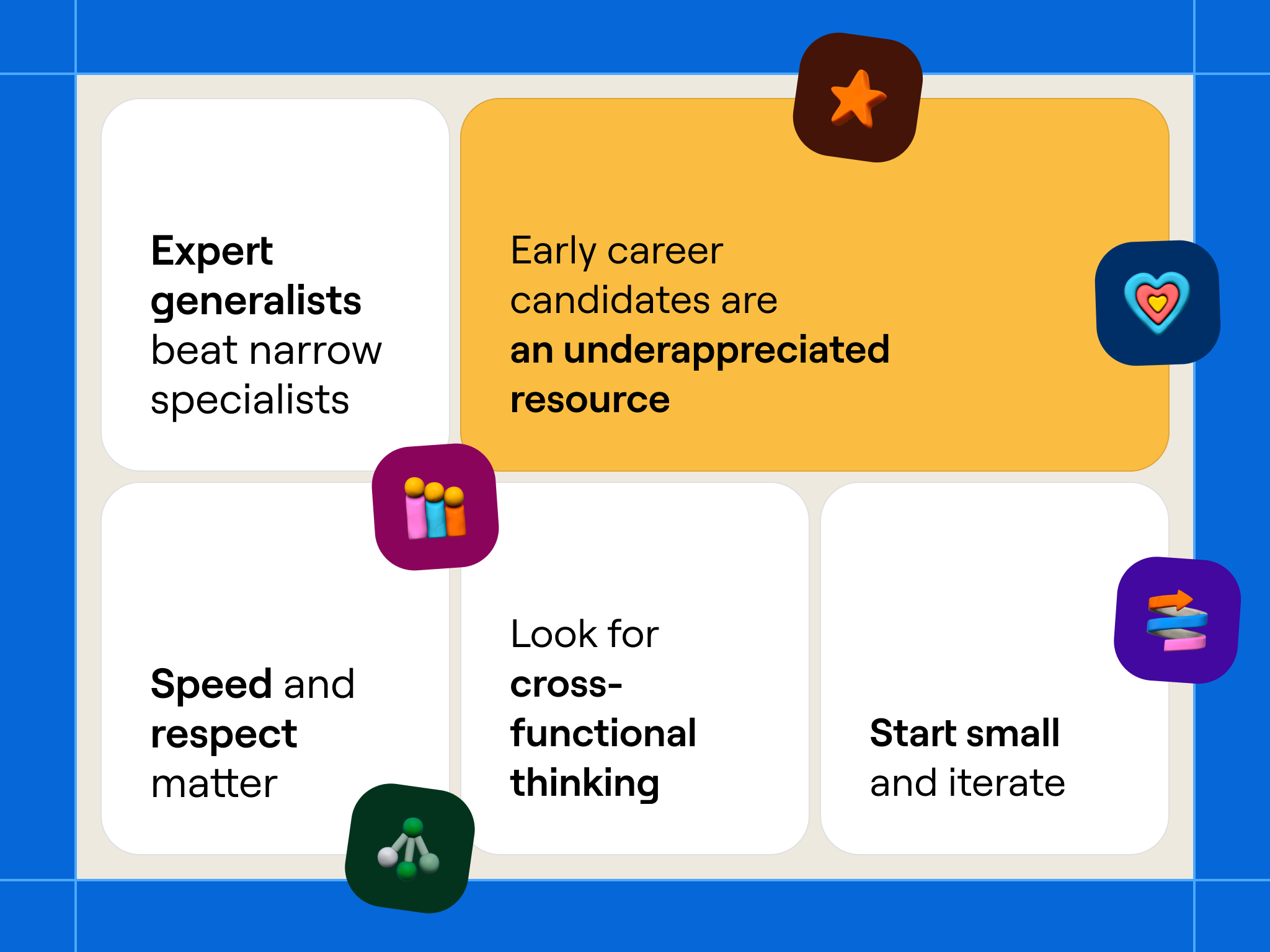 Speed matters, but stay under control. We compressed our hiring timeline not just for efficiency, but to create an exciting candidate experience. Flying people in for an interview day made the process feel special and helped candidates understand our culture firsthand.