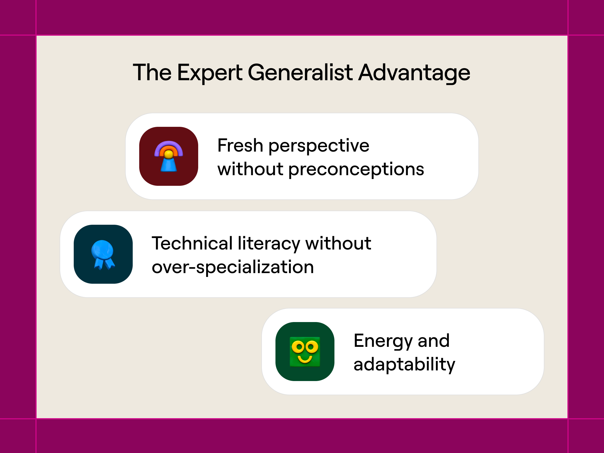 Look for cross-functional thinking—focus on candidates who can work across business functions rather than single-skill specialists