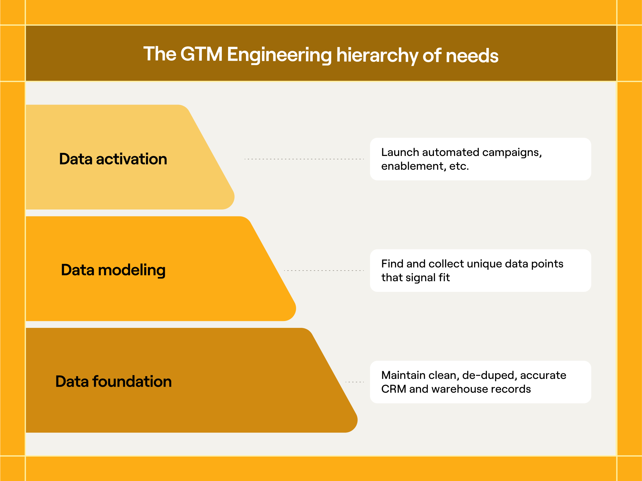 Like data scientists, GTM Engineers offer a portable toolkit that only works when the stack beneath it is solid. Their work progresses through three rungs, each building upon the last: